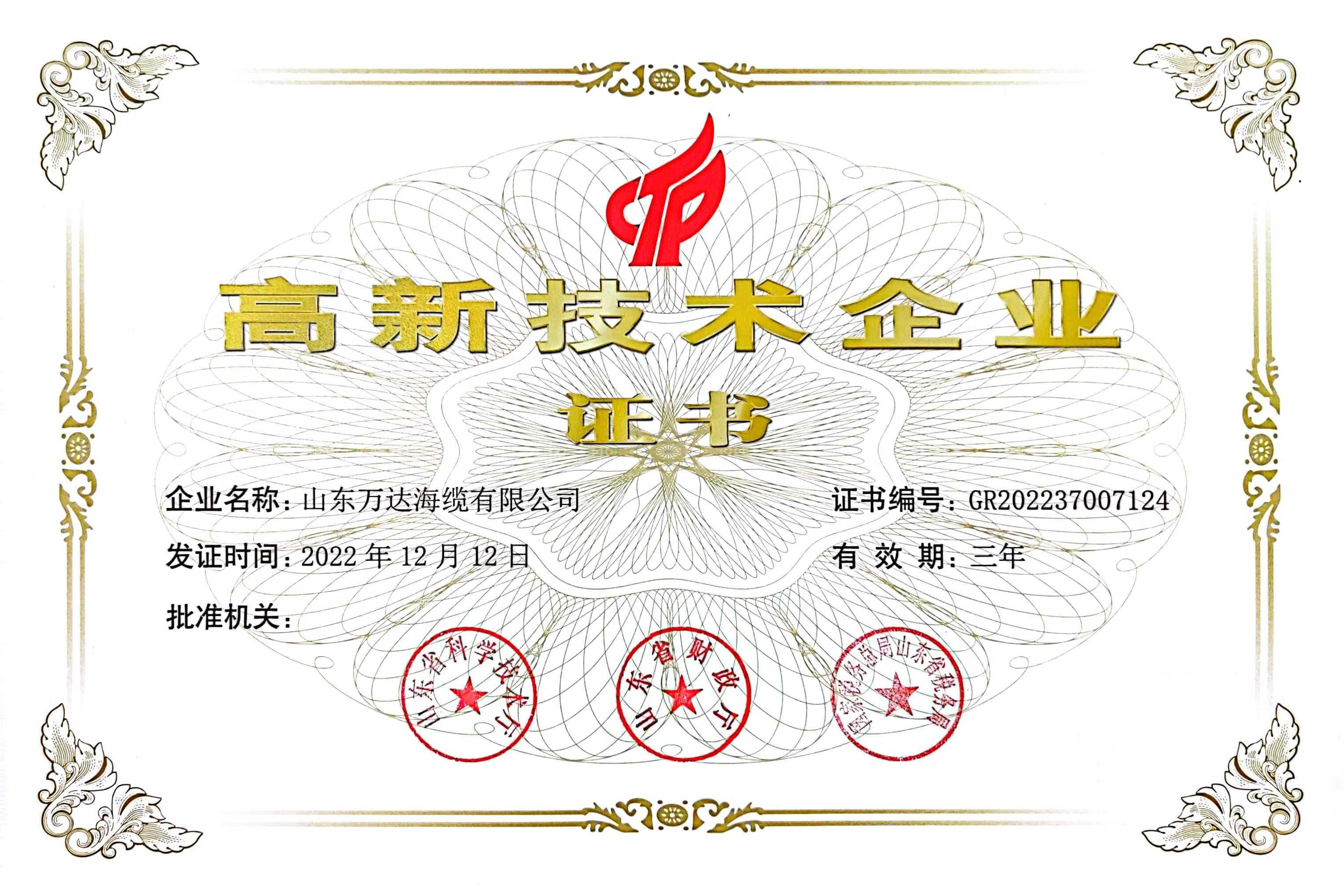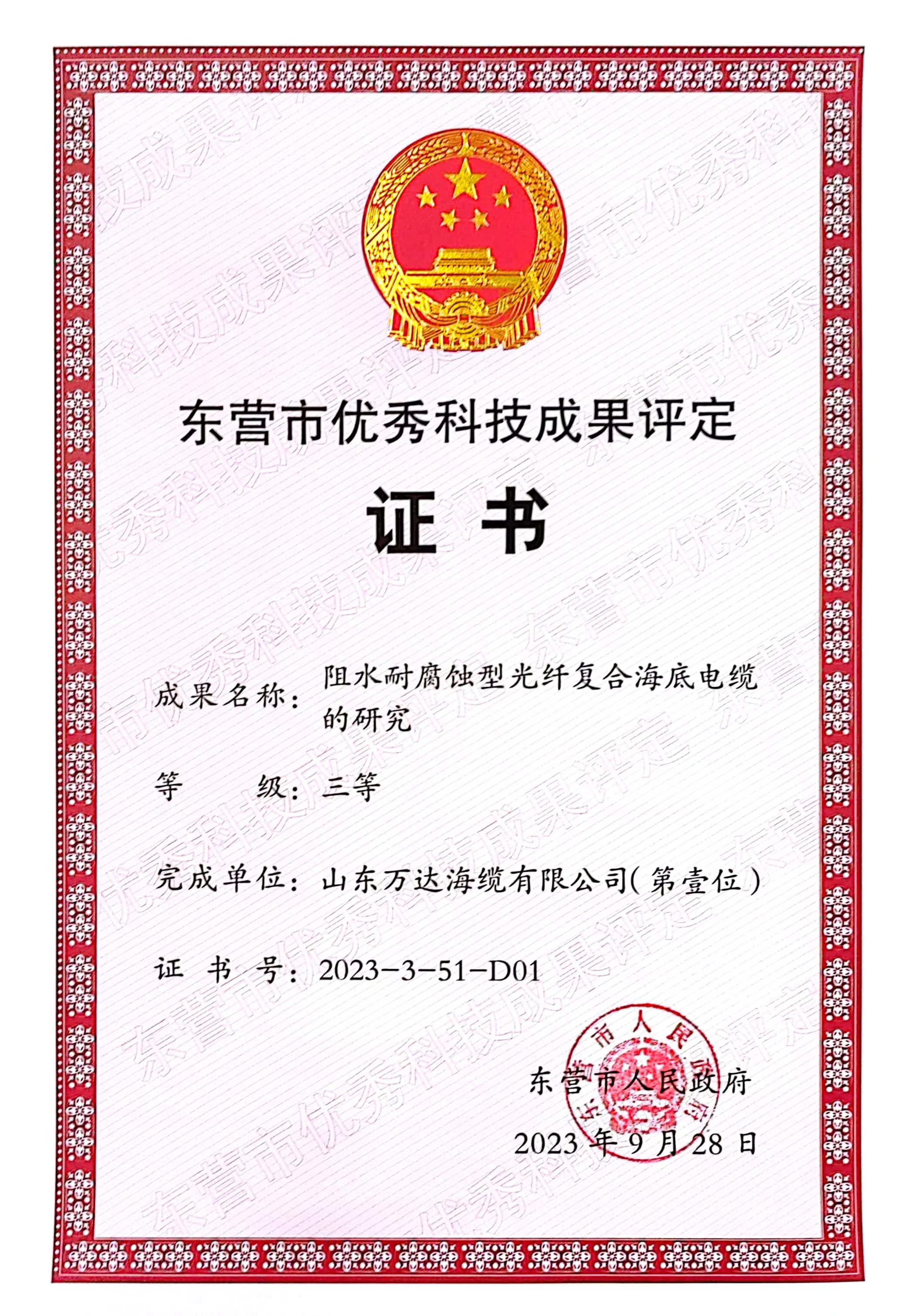 公司自成立以来重视科技创新工作,先后被认定为高新技术企业、国家级专精特新“小巨人”企业、山东省瞪羚企业、山东省先进中小企业、山东省现代海洋产业领域重点企业、山东省创新型中小企业和东营市科技型企业等荣誉称号,拥有山东省企业技术中心、山东省“一企一技术”研发中心、东营市重点实验室、东营市工程研究中心和东营市工业设计中心等科技创新平台。自主研发的220kV、110kV、66kV、35kV等系列电压等级的产品均己获得第三方国内权威机构型式试验报告,并参与66kV海缆TICW行业标准。研发的220kV及66kV光纤复合海底电缆分别荣誉2019和2020年中国风电产业十佳优秀产品。开发的新产品、新工艺转化形成国际PCT发明专利1项,国内发明专利15项,实用新型专利20余项,省级优秀论文6篇,省级优秀成果奖6项。