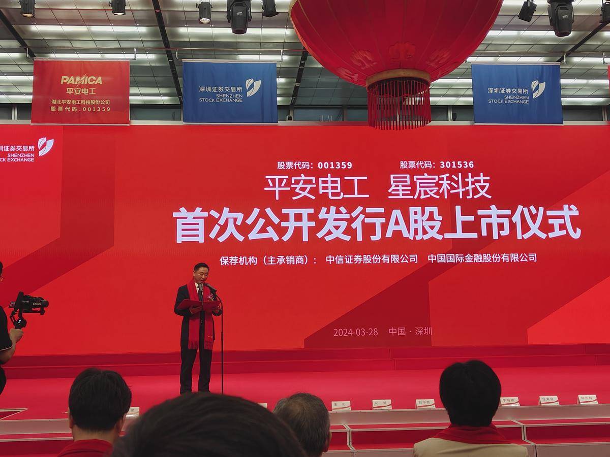 湖北日报讯(记者汪洋、王楚、通讯员毛新民)3月28日上午9时25分,深圳证券交易所8楼大厅内,随着喜庆的开市钟声敲响,湖北平安电工科技股份公司在主板上市交易,股票简称“平安电工”,股票代码“001359”。这是全面注册制正式实施以来,我省首家主板上市企业,也是咸宁通城县第二家上市公司。