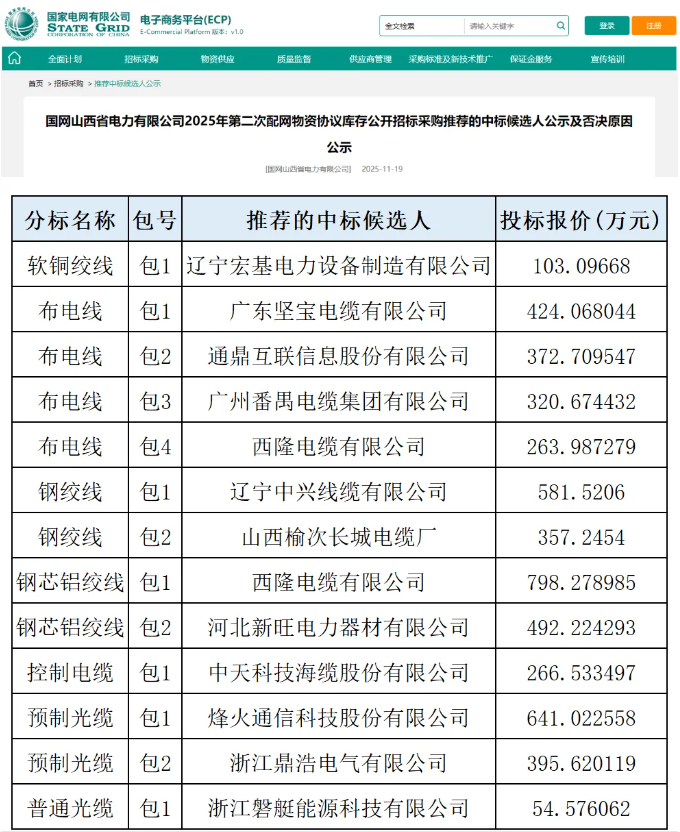 国网电子商务平台发布了《国网山西省电力有限公司2025年第二次配网物资协议库存公开招标采购推荐的中标候选人公示及否决原因公示》,该项目采购包括软铜绞线、钢芯铝绞线、布电线、普通光缆等物资,中标线缆企业详情见下表。