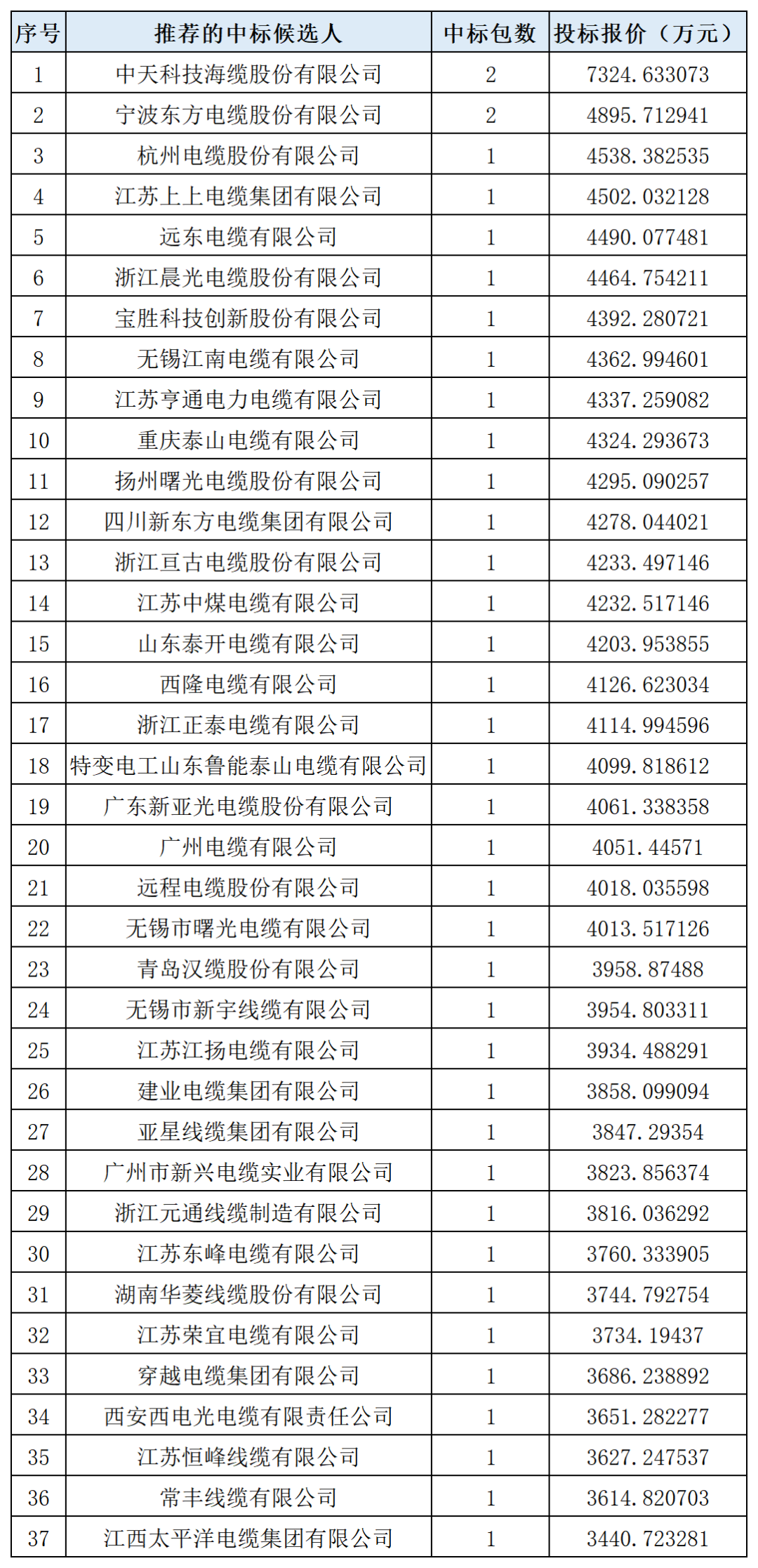 其中,中标前二十名企业为:中天科技海缆股份有限公司、宁波东方电缆股份有限公司、杭州电缆股份有限公司、江苏上上电缆集团有限公司、远东电缆有限公司、浙江晨光电缆股份有限公司、宝胜科技创新股份有限公司、无锡江南电缆有限公司、江苏亨通电力电缆有限公司、重庆泰山电缆有限公司、扬州曙光电缆股份有限公司、四川新东方电缆集团有限公司、浙江亘古电缆股份有限公司、江苏中煤电缆有限公司、山东泰开电缆有限公司、西隆电缆有限公司、浙江正泰电缆有限公司、特变电工山东鲁能泰山电缆有限公司、广东新亚光电缆股份有限公司、广州电缆有限公司,更多中标企业见榜单。