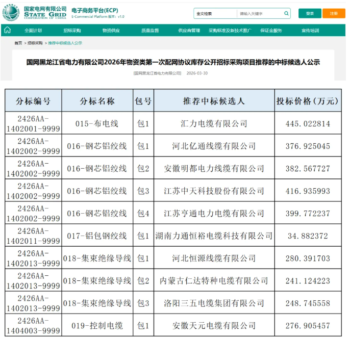 国网电子商务平台发布了《国网黑龙江省电力有限公司2026年物资类第一次配网协议库存公开招标采购项目推荐的中标候选人公示》,该项目采购包括布电线、钢芯铝绞线、铝包钢绞线、集束绝缘导线、控制电缆等物资,中标缆企情况见下表。